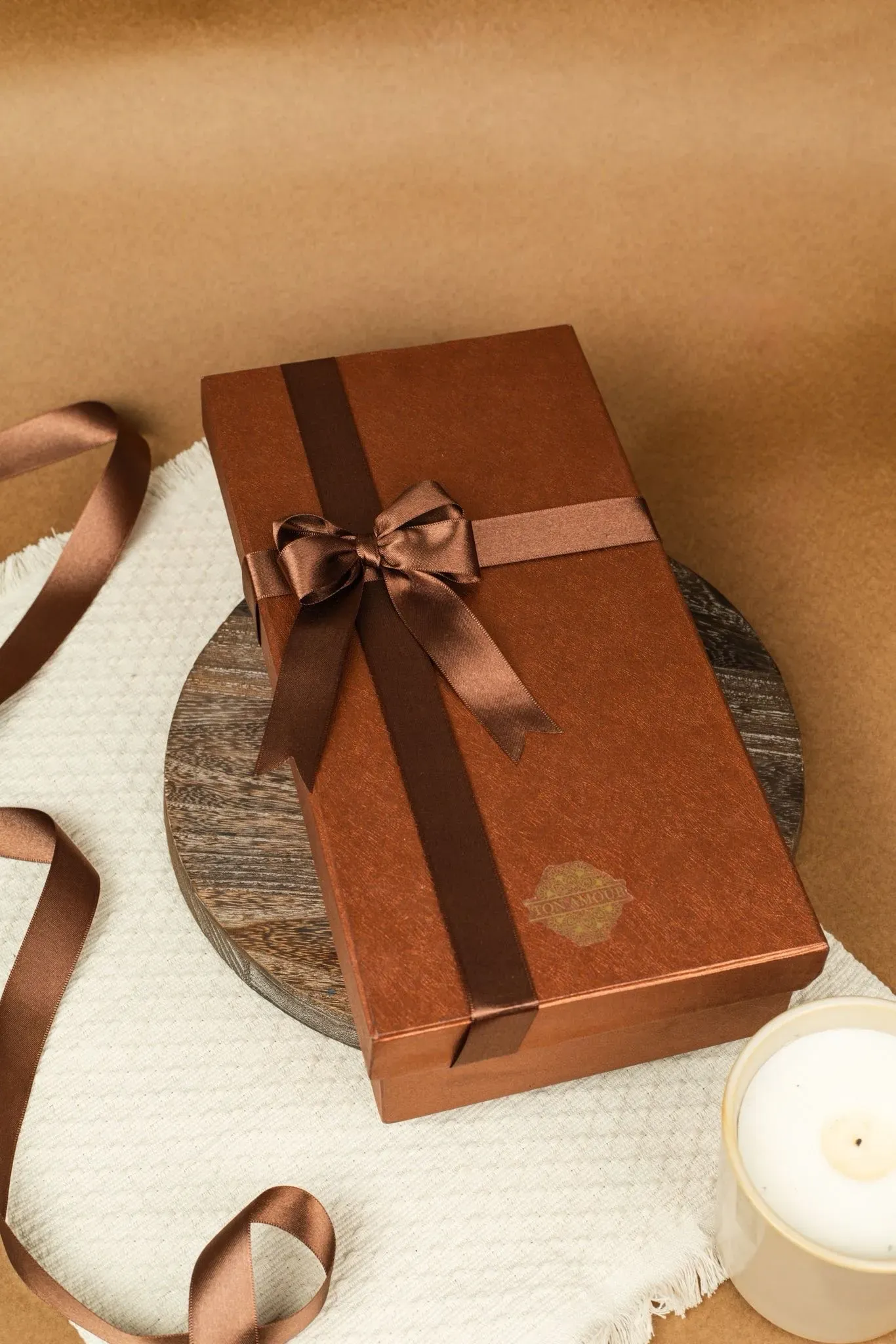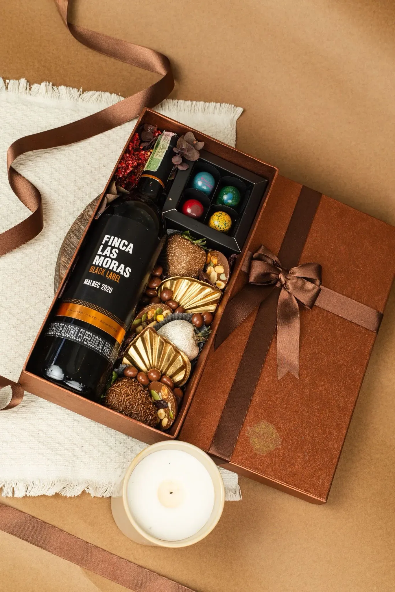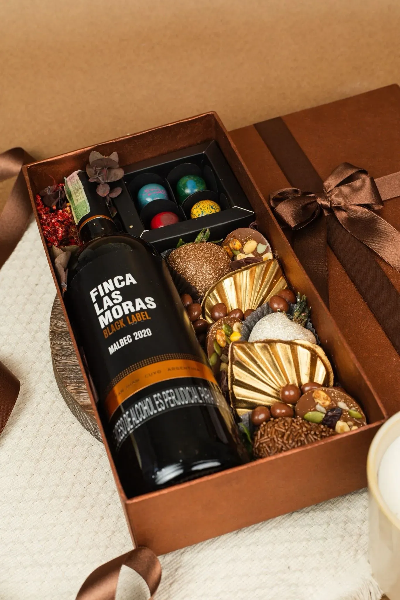 Nuestra caja navideña combina lo mejor de la temporada: una botella de vino Finca Las Moras 750ml, 4 fresas con chocolate, 2 palmas de chocolate artesanal, monedas de chocolate y una delicada caja de bombones x4, creados con nuestro chocolate real al 65 %.