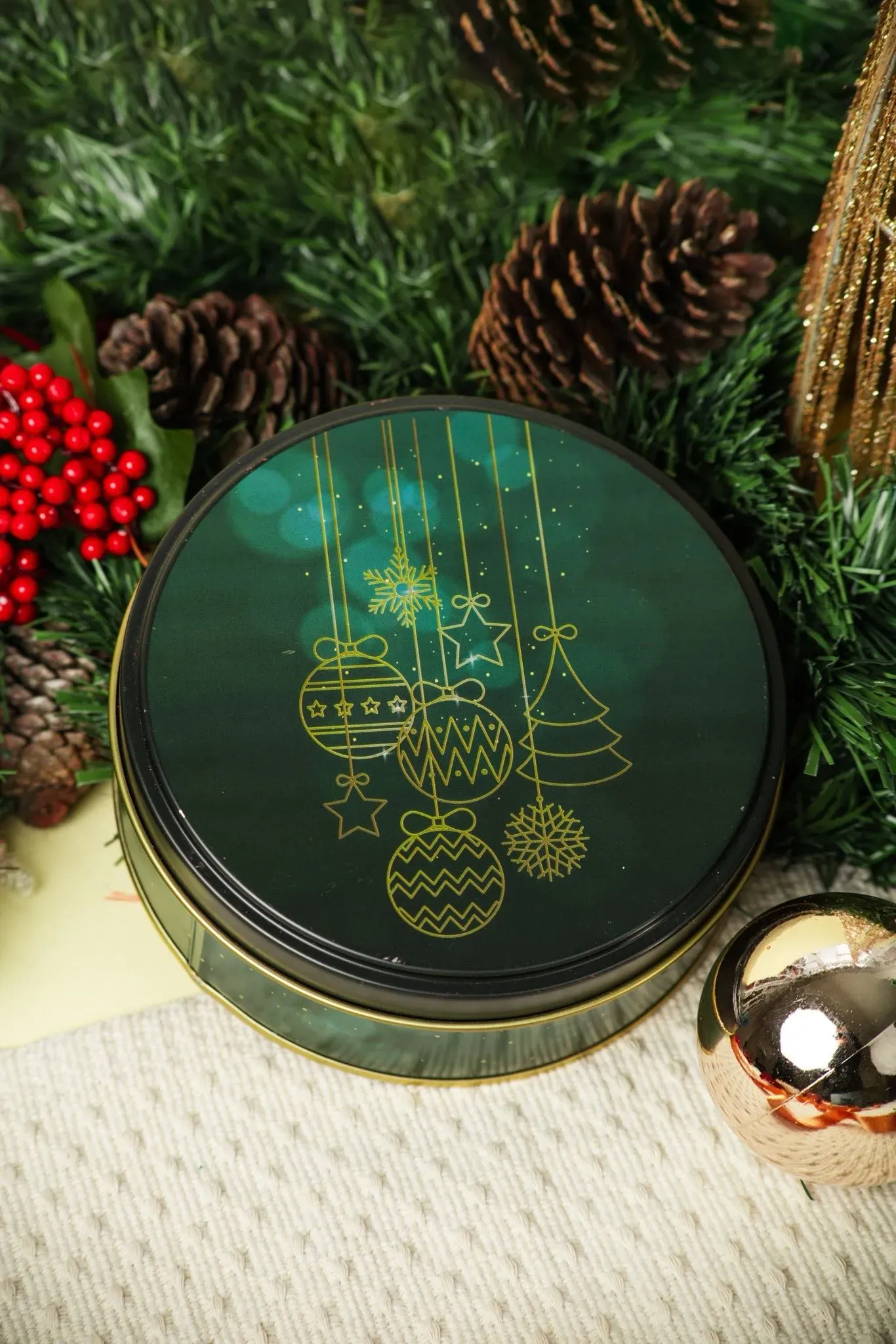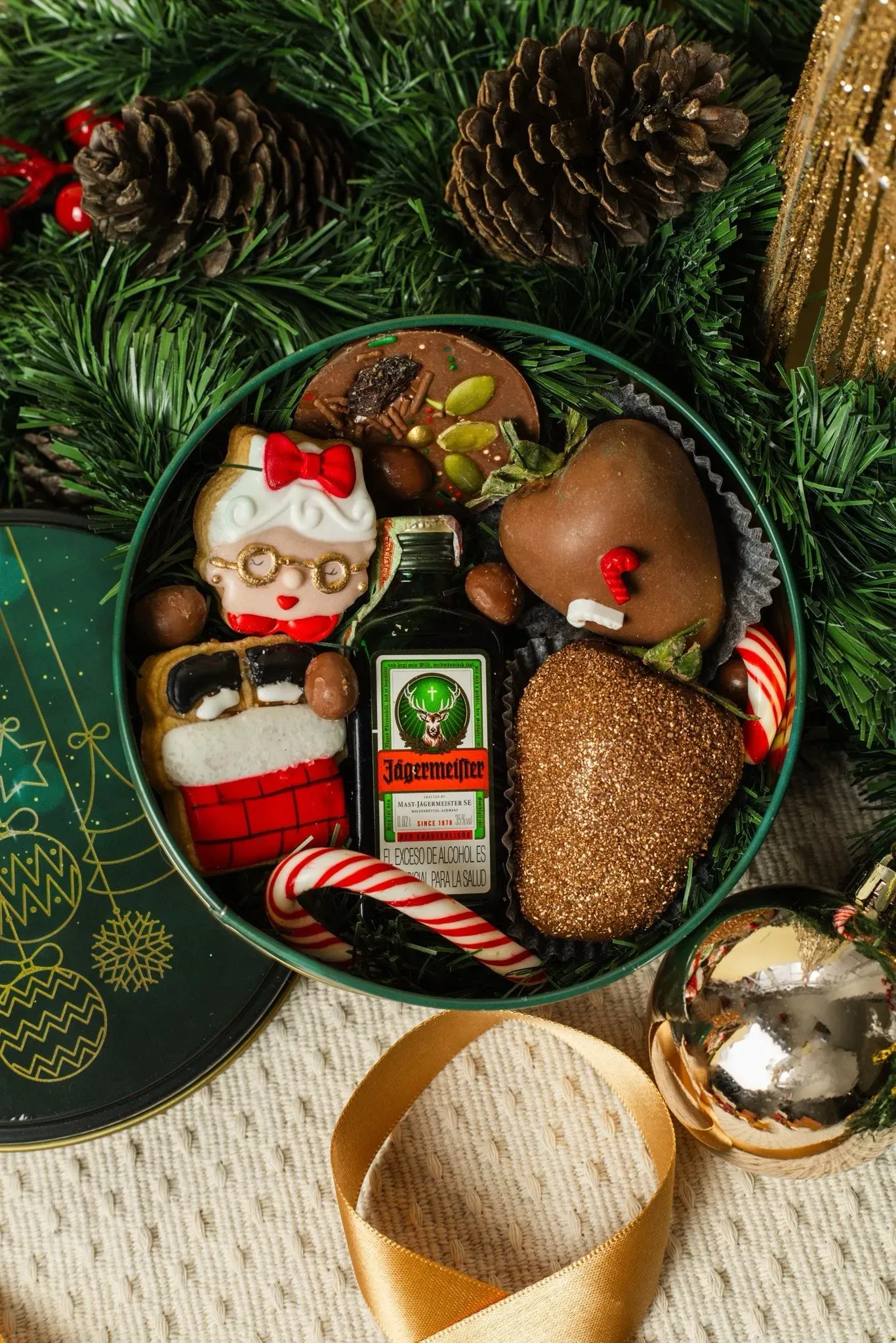 Jar metálico navideño contiene: 2 fresas con chocolate, licor jagermeister 50 ml, 2 galletas navideñas, bastón de menta y moneda de chocolate con frutos secos