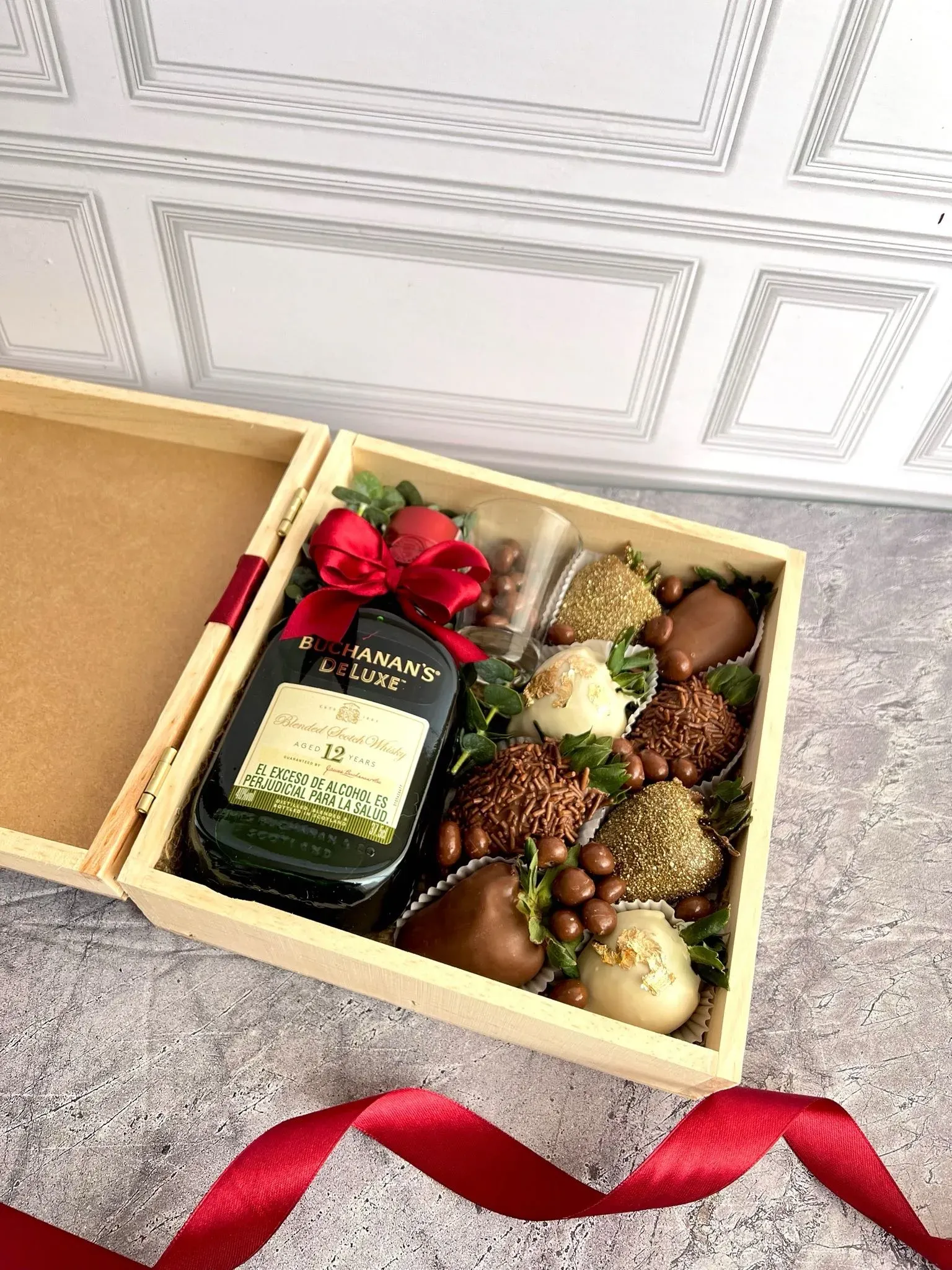 Disfruta del sabor único y tradicional del whisky escocés, ideal para cualquier ocasión y perfecto para compartir con amigos. Esta caja de madera incluye 8 fresas cubiertas con chocolate, una botella de whisky Buchanans de 375ml, una copa de shot, y uvas con chocolate.