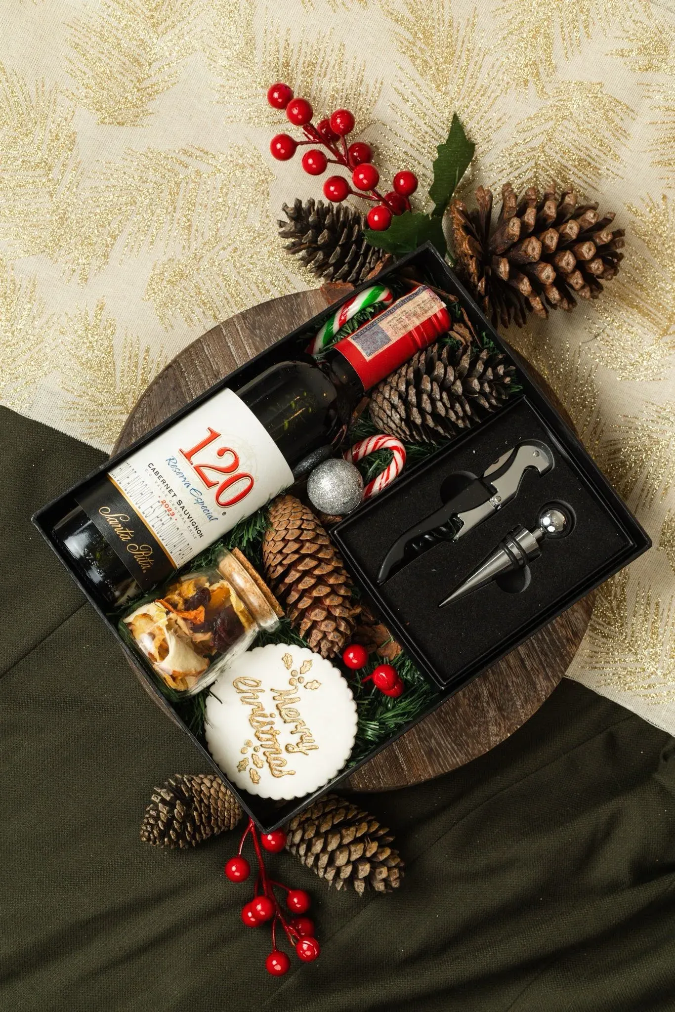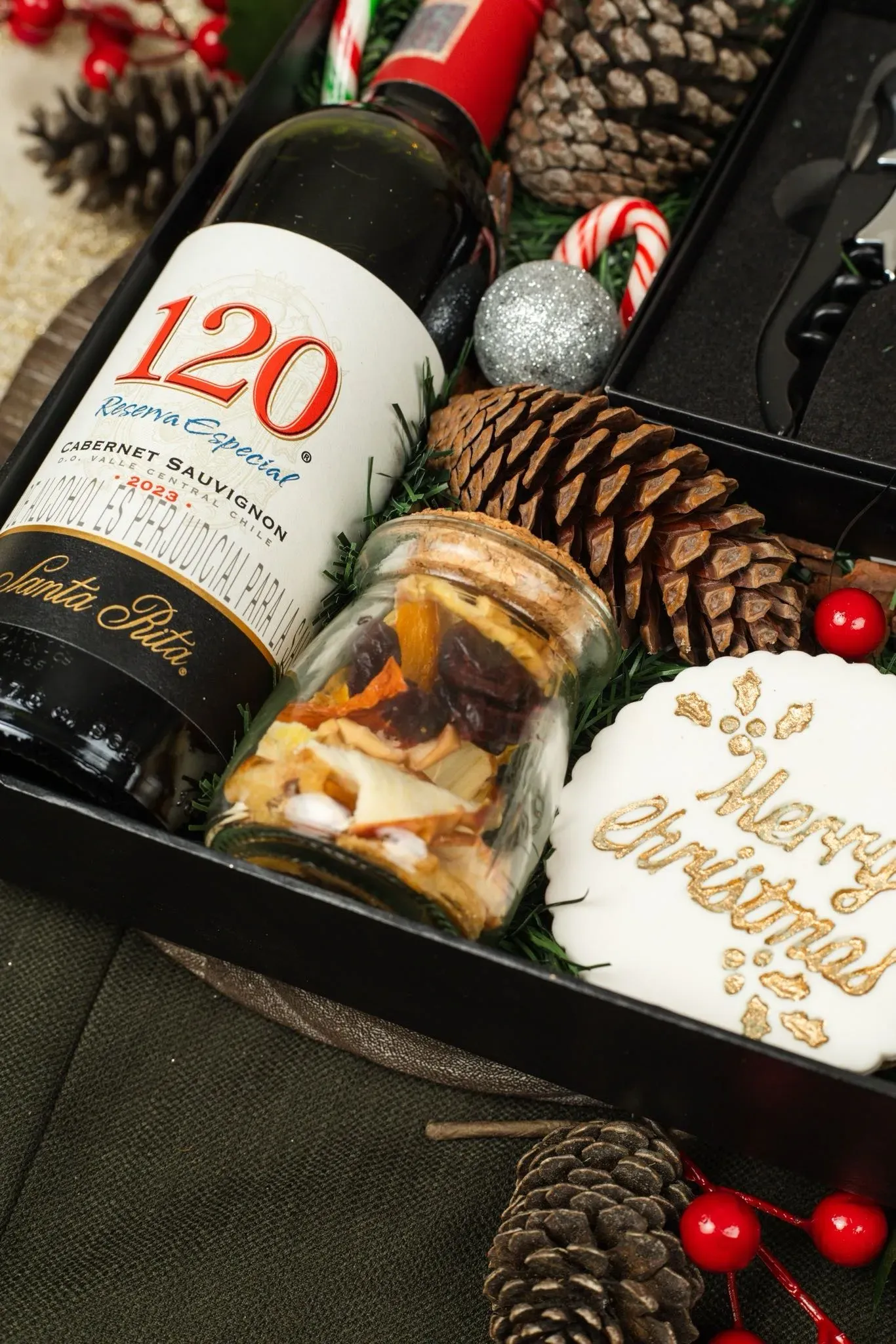 Nuestra caja Santa Rita Navidad combina la calidez del vino con el encanto artesanal de la temporada: una botella de Vino Santa Rita 120, un kit de vino con accesorios elegantes, una galleta navideña artesanal y un frasco de vidrio con frutas deshidratadas ideales ...