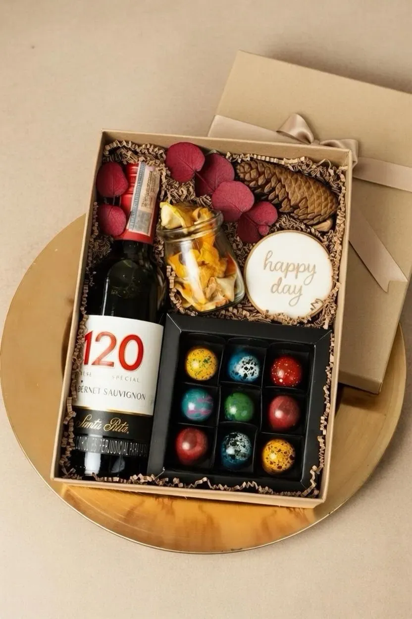 Incluye una botella de vino 375ml, una caja de bombones x9 elaborados con nuestro chocolate real al 65%, una galleta navideña artesanal y un frasco de vidrio con frutas deshidratadas, ideal para acompañar o ...